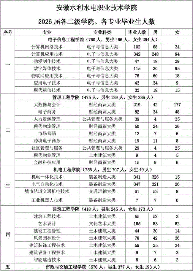安徽水利水电职业技术学院2026届生源信息 安徽水利水电职业技术学院2026届毕业生共5653人,其中,专科毕业生4974人,本科毕业生679人,详情如下: 推荐阅读安徽水利水电职业技术学院就业指导中心联系方式安徽生源信息查询系统