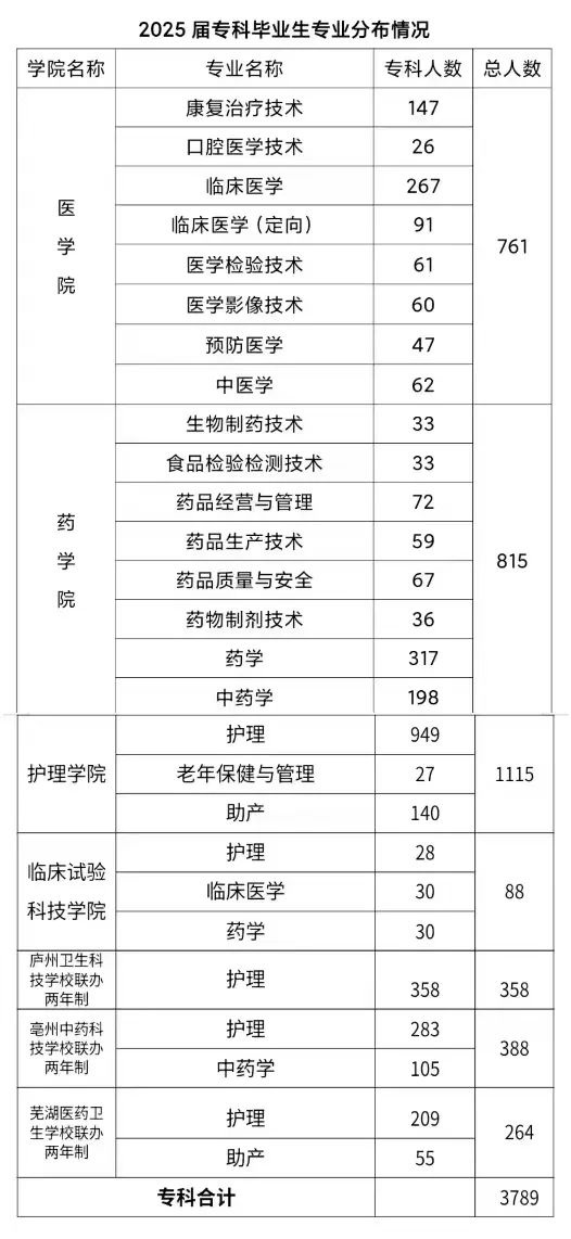 安庆医药高等专科学校2025届生源信息 安庆医药高等专科学校2025届毕业生共4115人,其中,专科毕业生3789人,专升本毕业生242人,中职毕业生84人,详情如下: 推荐阅读安庆医药高等专科学校就业指导中心联系方式安徽生源信息查询系统