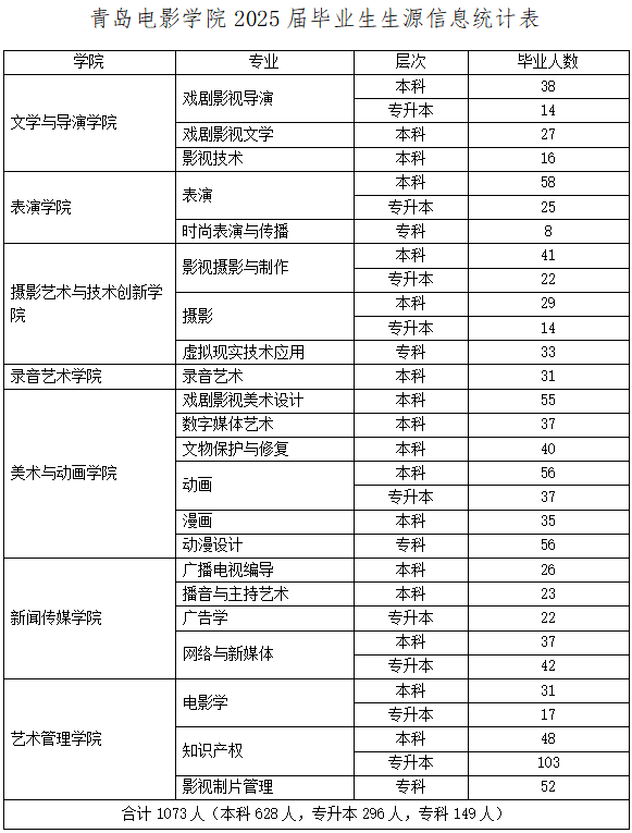 青岛电影学院2026届生源信息 青岛电影学院2026届毕业生共1366人,其中,本科892人,专升本206人,专科268人,详情见下方链接: 链接:青岛电影学院2026届毕业生生源信息分布表 青岛电影学院2025届毕业生共1073人,其中,本科生628人,专升本296人,专科149人,详情见下图: 推荐阅读青岛电影学院就业指导中心联系方式山东生源信息查询系统