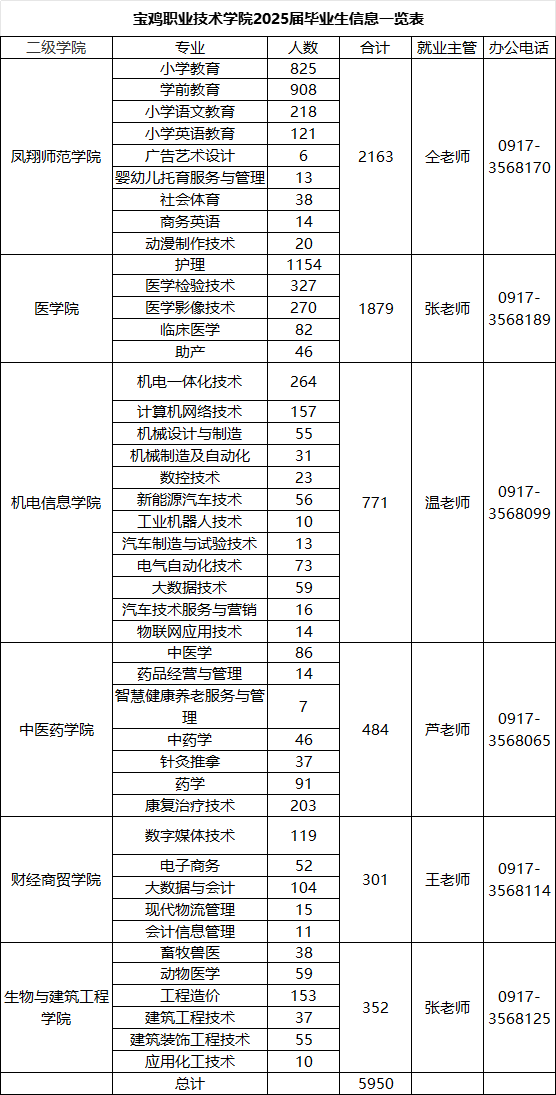 宝鸡职业技术学院2025届毕业生共5950人,详情见下图: