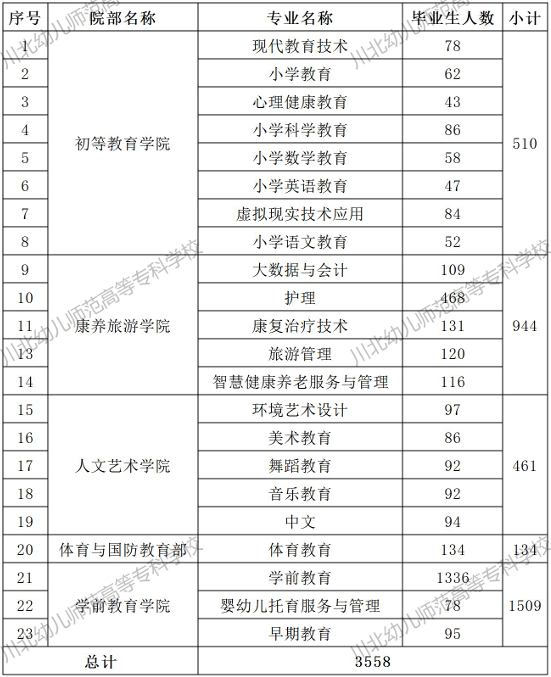 川北幼儿师范高等专科学校2025届毕业生共3558人,详情见下图: