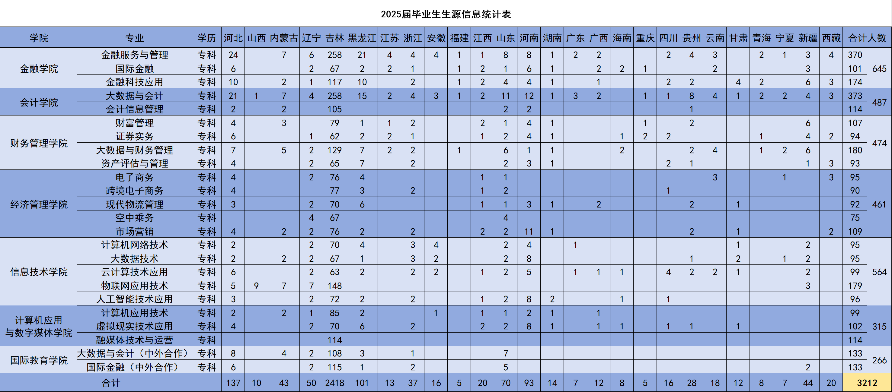 长春金融高等专科学校2026届生源信息 链接:长春金融高等专科学校2026届生源信息 长春金融高等专科学校2025届毕业生共3212人,详情如下: 附件:长春金融高等专科学校2025届生源信息.png 推荐阅读长春金融高等专科学校就业指导中心联系方式吉林生源信息查询系统