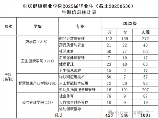 重庆健康职业学院2025届毕业生共1001人,其中,女生546人,男生455人,详情见下图: