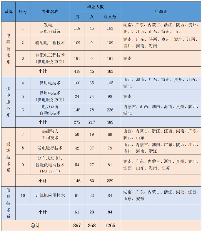 长沙电力职业技术学院2026届生源信息 链接:长沙电力职业技术学院2026届生源信息 长沙电力职业技术学院2025届毕业生共1265人,其中,女生368人,男生897人,详情见下图: 推荐阅读长沙电力职业技术学院就业指导中心联系方式 湖南生源信息查询系统