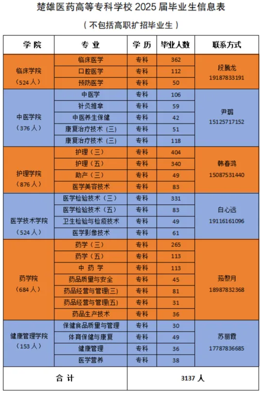 楚雄医药高等专科学校2025届毕业生共3137人,详情见下图: