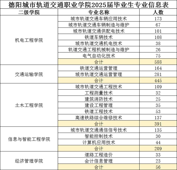 德阳城市轨道交通职业学院2025届毕业生共1689人,详情见下图: