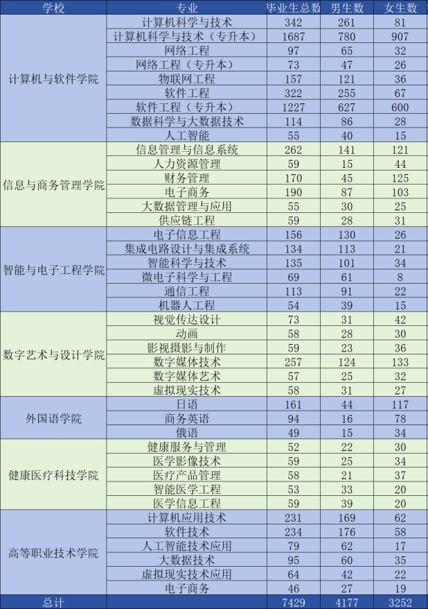 大连东软信息学院2026届毕业生共7429人,其中,女生3252人,男生4177人,详情见下图: