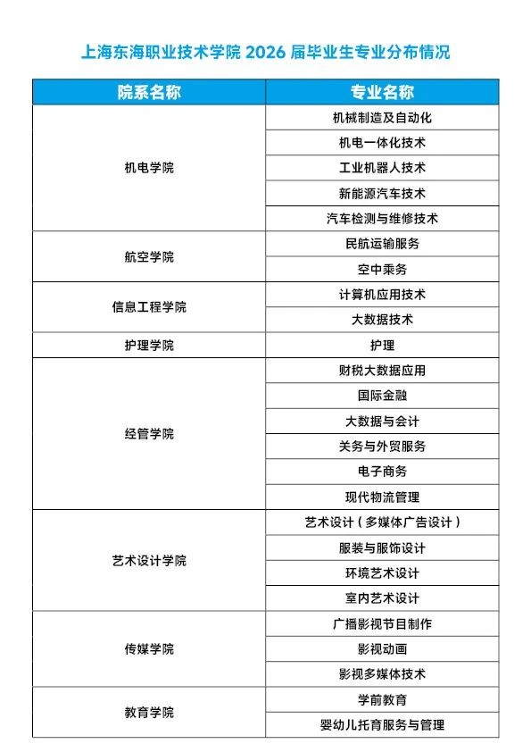 上海东海职业技术学院2026届生源信息 上海东海职业技术学院2026届毕业生专业分布见下图: 上海东海职业技术学院2023届毕业生共2560人,详情见下图: 推荐阅读上海东海职业技术学院就业指导中心联系方式 上海生源信息查询系统