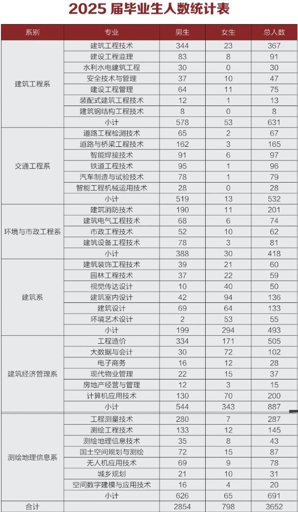 甘肃建筑职业技术学院2025届生源信息 甘肃建筑职业技术学院2025届毕业生共3652人,其中,女生798人,男生2854人,详情如下: 推荐阅读甘肃建筑职业技术学院就业指导中心联系方式甘肃生源信息查询系统
