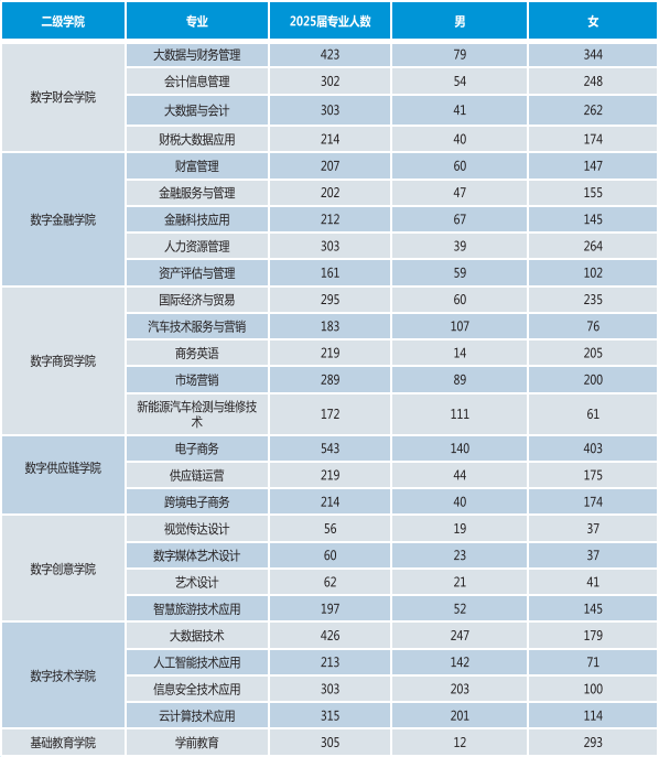 广东财贸职业学院2025届生源信息 广东财贸职业学院2025届毕业生共6398人,其中,女生4387人,男生2011人,详情如下: 推荐阅读广东财贸职业学院就业指导中心联系方式 广东高校生源信息查询系统