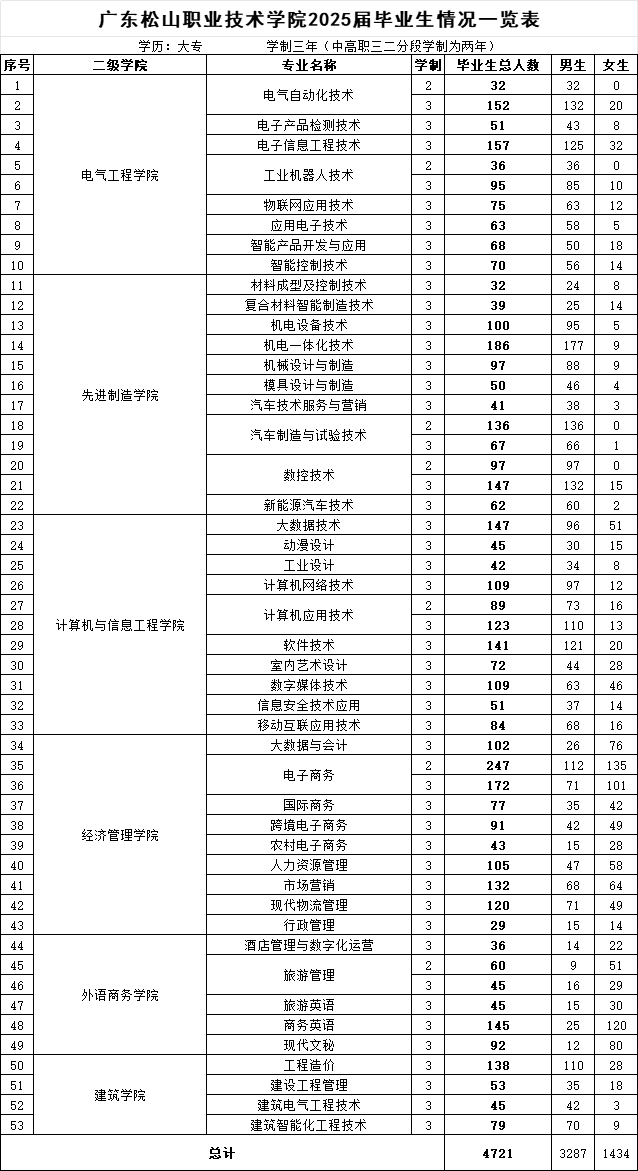 广东松山职业技术学院2025届生源信息 广东松山职业技术学院2025届毕业生共4721人,其中,女生1434人,男生3287人,详情如下: 推荐阅读广东松山职业技术学院就业指导中心联系方式广东高校生源信息查询系统
