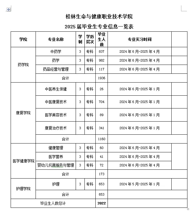 桂林生命与健康职业技术学院2025届毕业生共3922人,详情见下图: