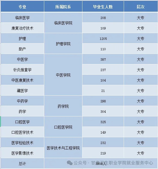 甘肃卫生职业学院2025届毕业生共3908人,详情如下: