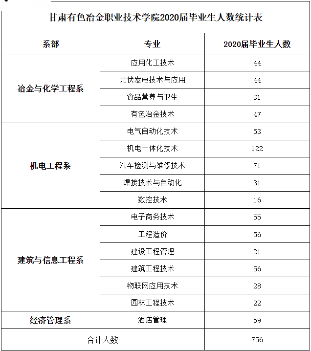 甘肃有色冶金职业技术学院2020届毕业生共756人,详情如下: