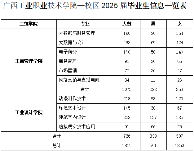 广西工业职业技术学院南宁一校区2025届毕业生共1811人,详情见下图: