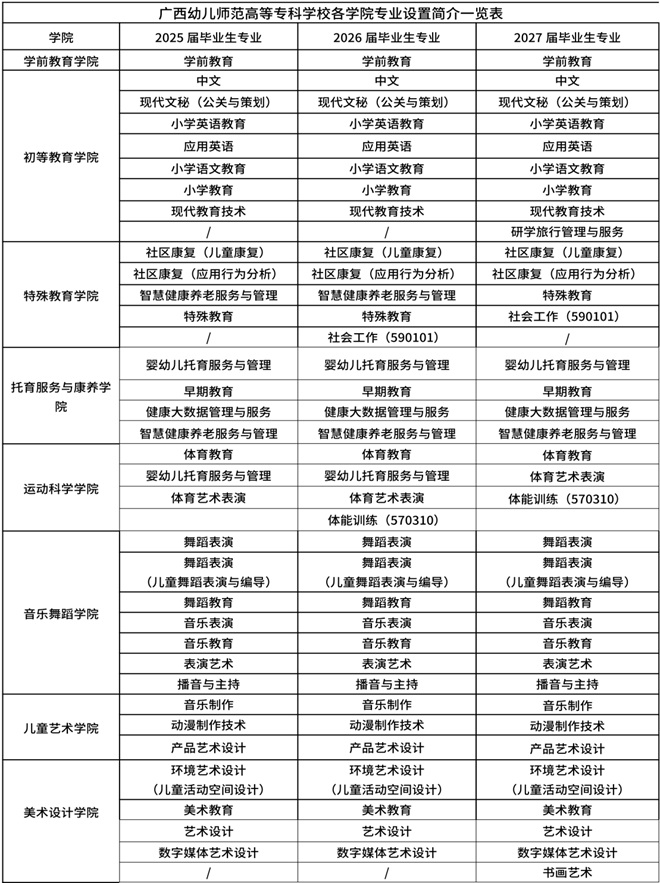 广西幼儿师范高等专科学校2025届、2026届、2027届各学院专业设置见下图:
