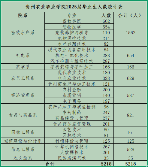 贵州农业职业学院2025届毕业生共5218人,详情见下图:
