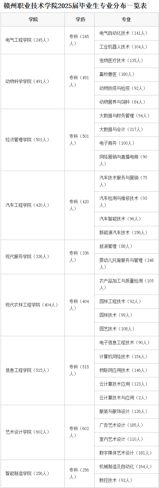 赣州职业技术学院2025届毕业生共3770人,详情如下: