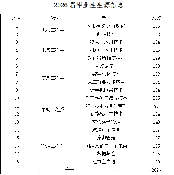 贵州机电职业技术学院2026届毕业生共2876人,详情见下图: