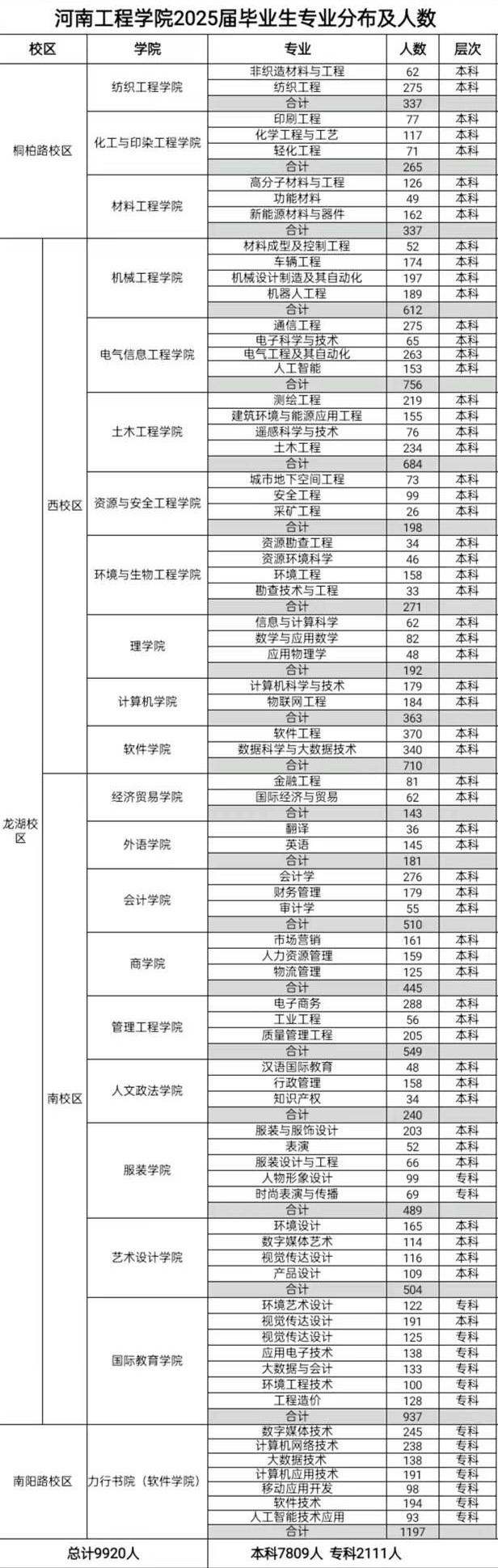 河南工程学院2026届生源信息 链接:河南工程学院2026届生源信息 河南工程学院2025届毕业生共9920人,其中,本科毕业生7809人,专科毕业生2111人,详情见下图: 推荐阅读河南工程学院就业指导中心联系方式河南生源信息查询系统
