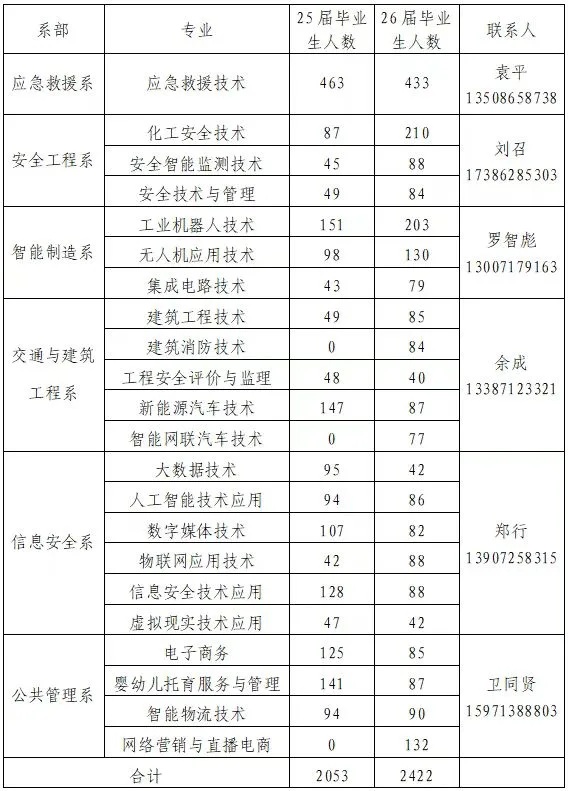 湖北黄冈应急管理职业技术学院2026届毕业生共2422人,2025届毕业生共2053人,详情见下图: