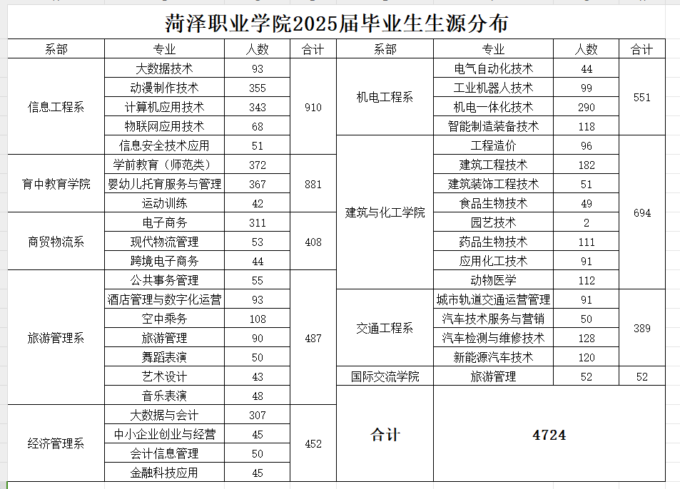 菏泽职业学院2025届毕业生共4724人,详情见下图: