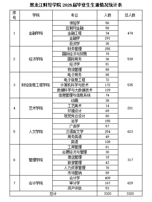 黑龙江财经学院2026届生源信息 黑龙江财经学院2026届毕业生共3320人,详情如下: 黑龙江财经学院2025届毕业生共3534人,详情如下: 推荐阅读黑龙江财经学院就业指导中心联系方式黑龙江生源信息查询系统
