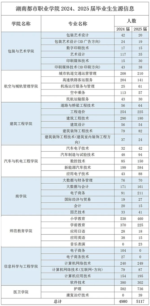 湖南都市职业学院2025届毕业生共5117人,详情如下:
