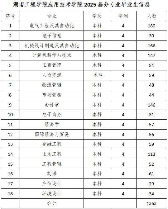 湖南工程学院应用技术学院2025届毕业生共1363人,详情见下图: