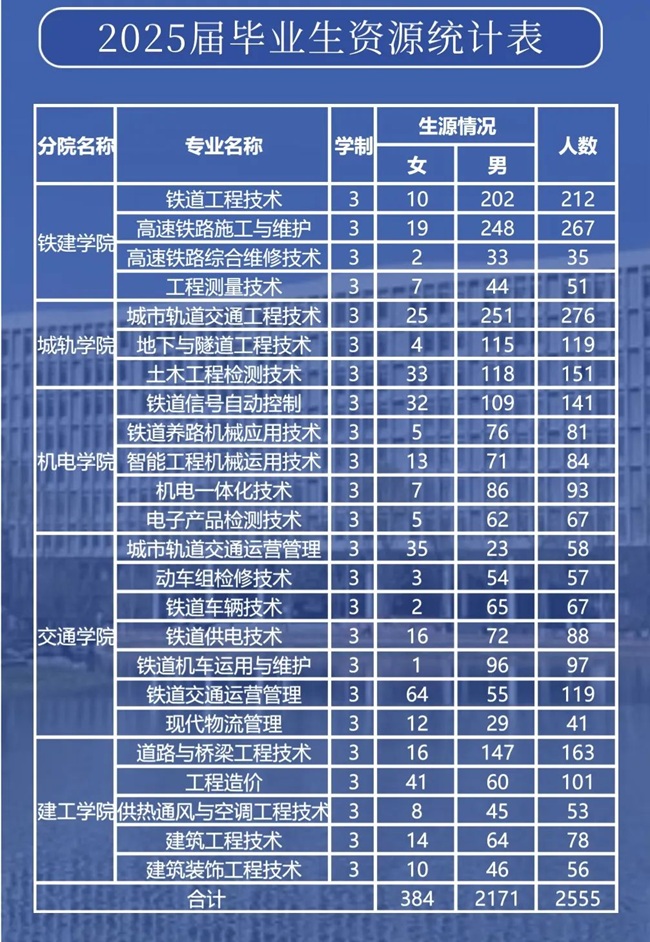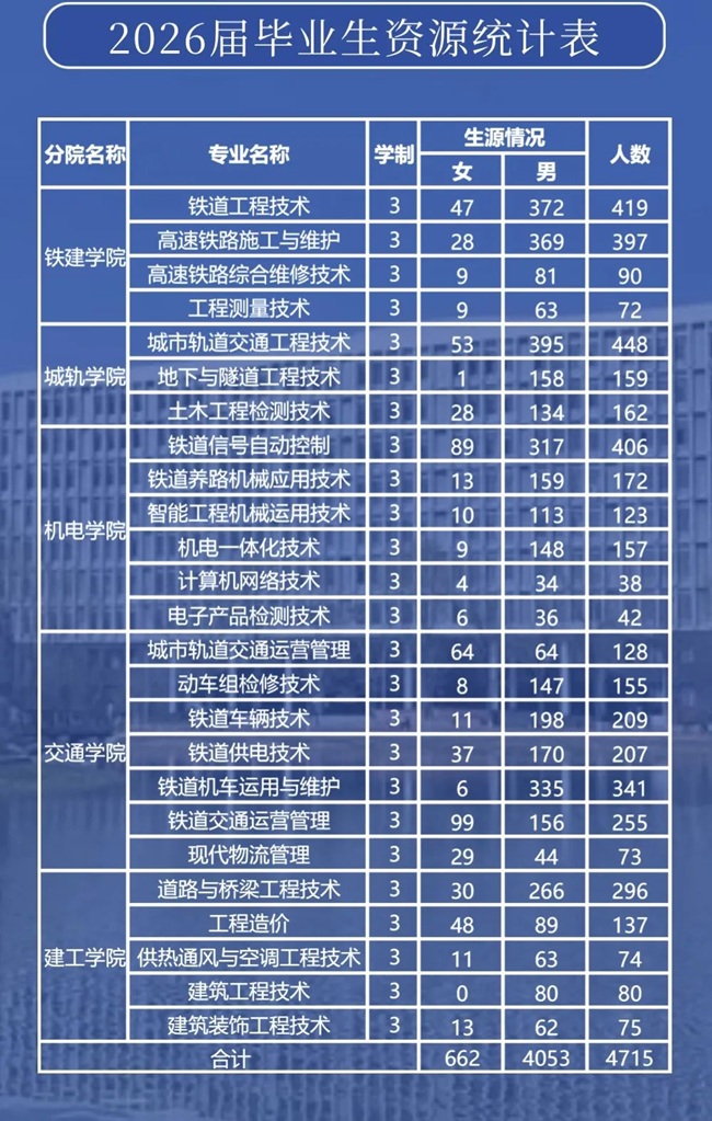 哈尔滨铁道职业技术学院2026届生源信息 哈尔滨铁道职业技术学院2026届毕业生共4715人,详情见下图: 哈尔滨铁道职业技术学院2025届毕业生共2555人,详情见下图: 推荐阅读哈尔滨铁道职业技术学院就业指导中心联系方式 黑龙江生源信息查询系统