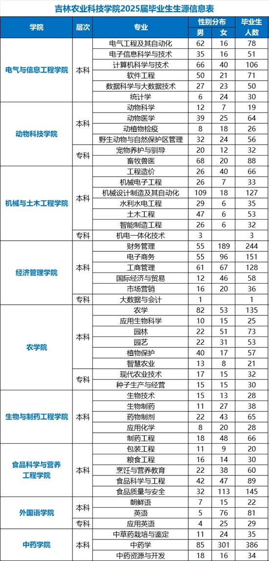吉林农业科技学院2026届生源信息 吉林农业科技学院2026届毕业生共3456人,其中,女生1830人,男生1626人,详情见下方链接: 链接:吉林农业科技学院2026届生源信息 吉林农业科技学院2025届毕业生共3220人,其中,本科毕业生3005人,专科毕业生215人,详情见下图: 推荐阅读吉林农业科技学院就业指导中心联系方式 吉林生源信息查询系统