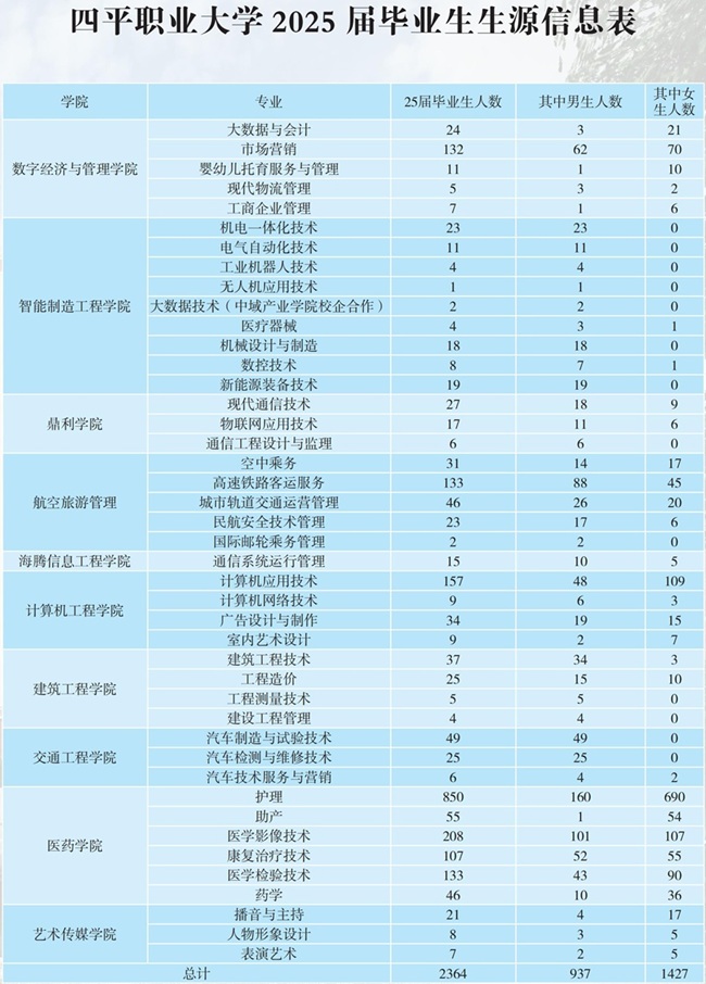 四平职业大学2026届生源信息 四平职业大学2026届毕业生共2400人,其中,女生1397人,男生1003人,详情见下图: 四平职业大学2025届毕业生共2364人,其中,女生1427人,男生937人,详情见下图: 推荐阅读四平职业大学就业指导中心联系方式 吉林生源信息查询系统