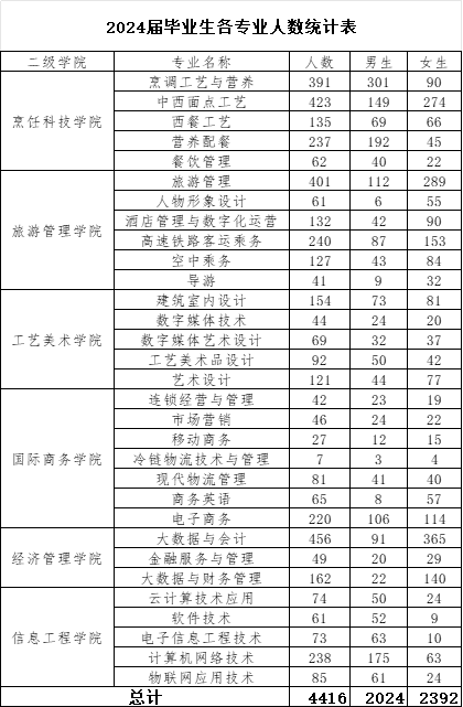 江苏旅游职业学院2024届毕业生共4416人,其中,女生2392人,男生2024人,详情如下: