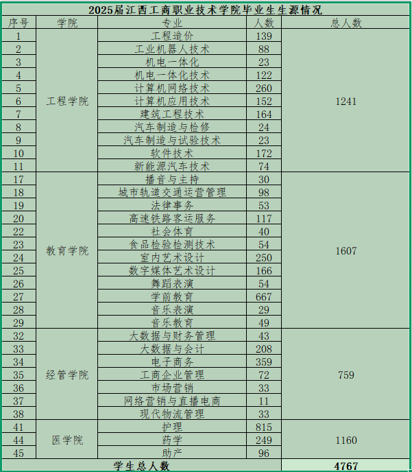 江西工商职业技术学院2026届生源信息 江西工商职业技术学院2026届毕业生共4890人,详情见附件: 附件:江西工商职业技术学院2026届毕业生生源情况.xlsx 江西工商职业技术学院2025届毕业生共4767人,详情如下: 推荐阅读江西工商职业技术学院就业指导中心联系方式 江西生源信息查询系统