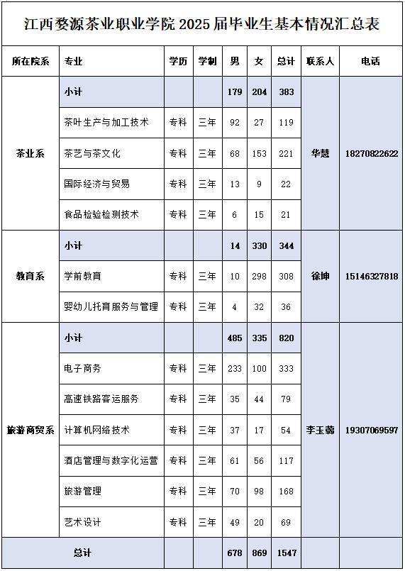 江西婺源茶业职业学院2025届生源信息 江西婺源茶业职业学院2025届毕业生共1547人,其中,女生869人,男生678人,详情见下图: 推荐阅读江西婺源茶业职业学院就业指导中心联系方式 江西生源信息查询系统