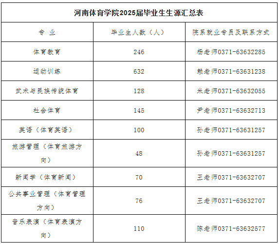 河南体育学院2025届本科毕业生共计1555人,各系相关专业毕业生分布情况及联系方式,详见下图: