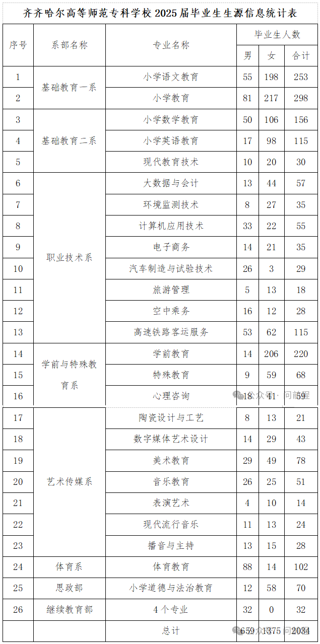 齐齐哈尔高等师范专科学校2025届毕业生共2034人,其中,男生659人,女生1375人,详情见下图: