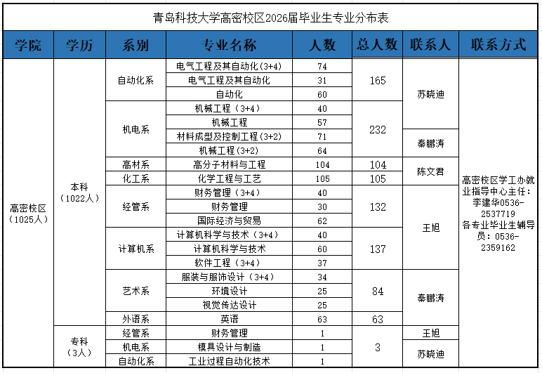 青岛科技大学高密校区2026届生源信息 青岛科技大学高密校区2026届毕业生1025人,详情见附件: 附件:青岛科技大学高密校区2026届毕业生专业分布表.png 青岛科技大学高密校区2025届毕业生1052人,其中本科生1025人,专科生27人,详情见附件: 附件:青岛科技大学高密校区2025届毕业生生源分布.xlsx