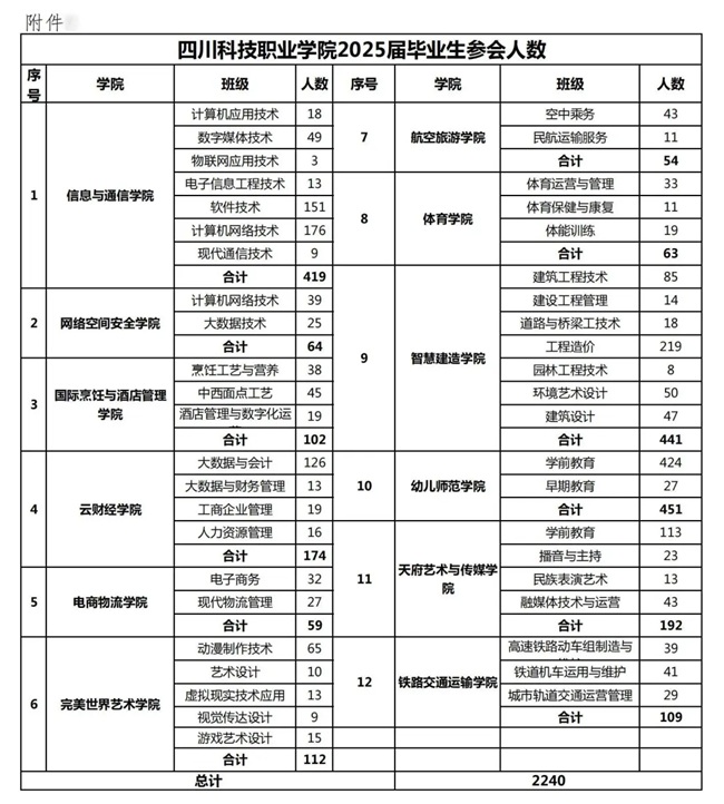 四川科技职业学院2025届毕业生共2240人,详情如下: