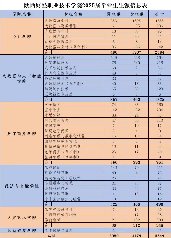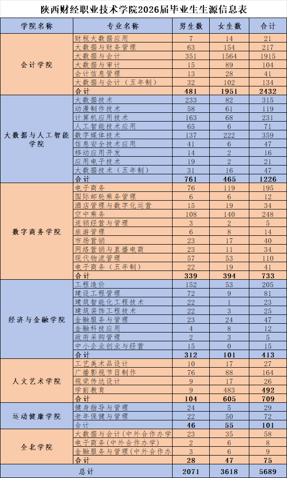陕西财经职业技术学院2026届生源信息 陕西财经职业技术学院2026届毕业生共5689人,其中,女生3618人,男生2071人,详情如下: 陕西财经职业技术学院2025届毕业生共5549人,其中,女生3479人,男生2080人,详情如下: 推荐阅读陕西财经职业技术学院就业指导中心联系方式陕西生源信息查询系统