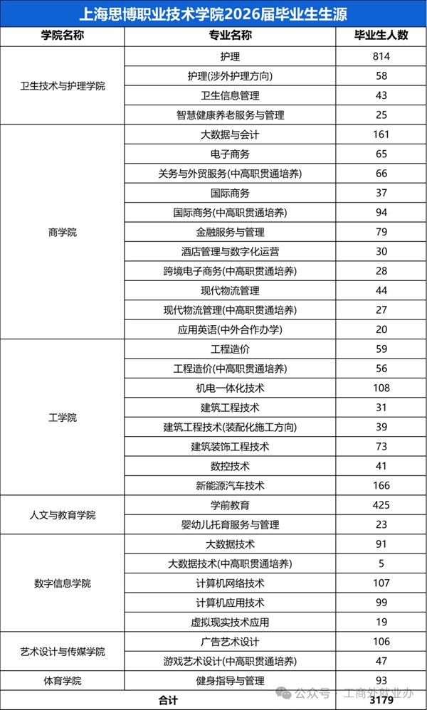 上海思博职业技术学院2026届毕业生共3179人,详情见下图: