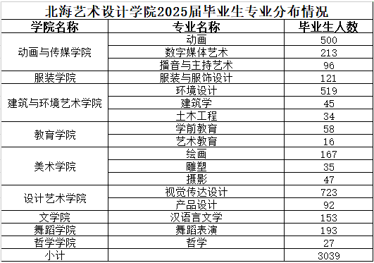 北海艺术设计学院2025届毕业生共3039人,详情见下图: