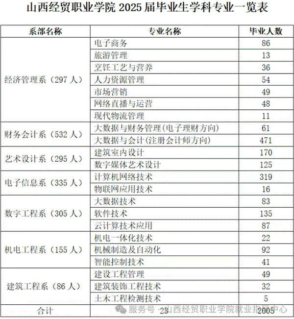 山西经贸职业学院2025届毕业生共2005人,详情见下图:
