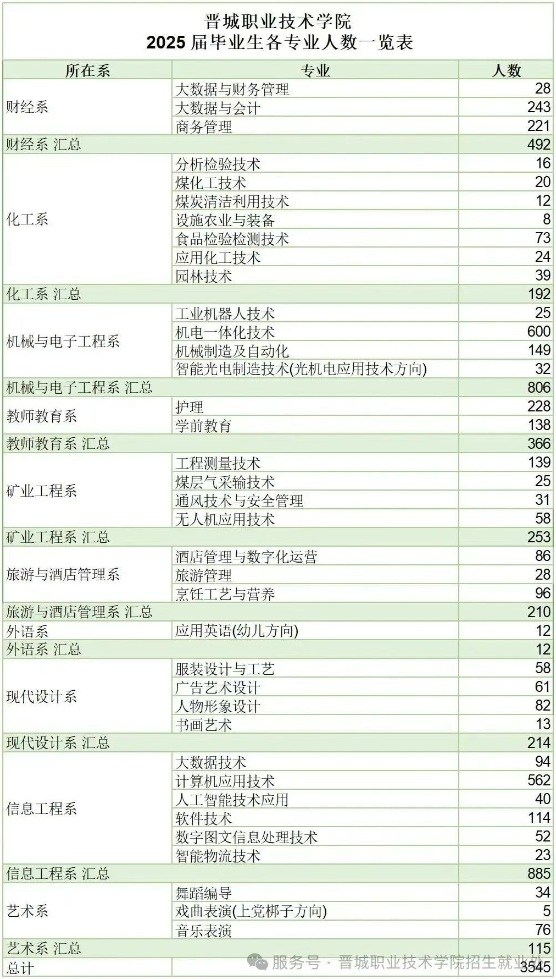晋城职业技术学院2025届毕业生共3545人,详情见下图: