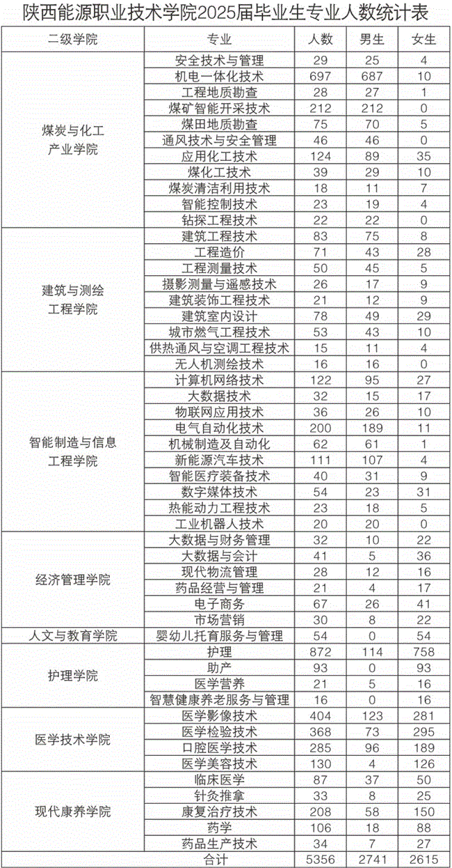 陕西能源职业职业技术学院2025届毕业生共5356人,其中,女生2615人,男生2741人,详情如下: