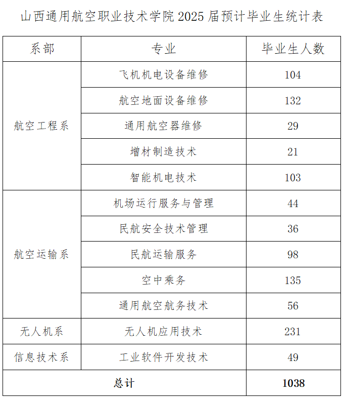山西通用航空职业技术学院2025届毕业生共1038人,详情如下: