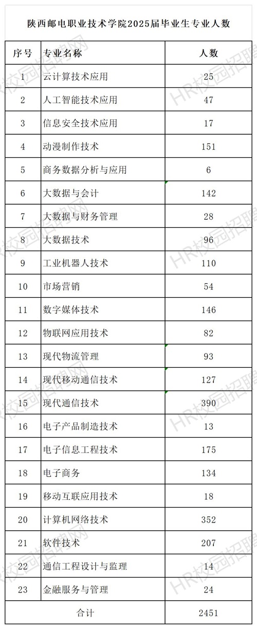 陕西邮电职业技术学院2025届毕业生共2451人,详情见下图: