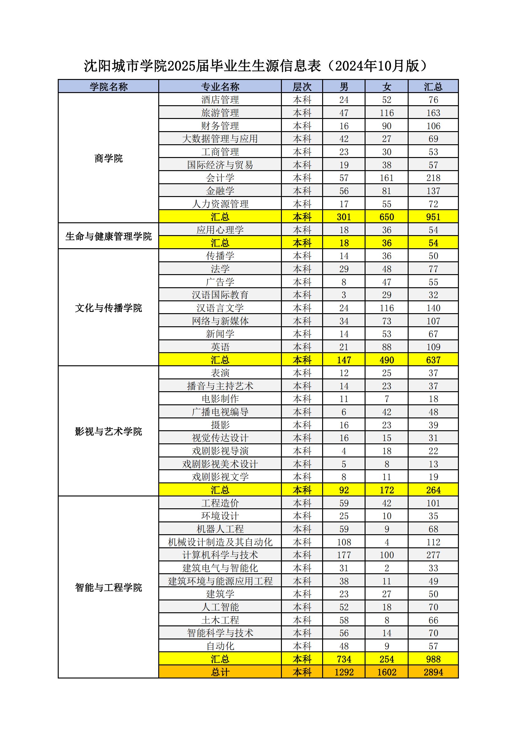 沈阳城市学院2025届毕业生共2894人,其中,女生1602人,男生1292人,详情见下图: