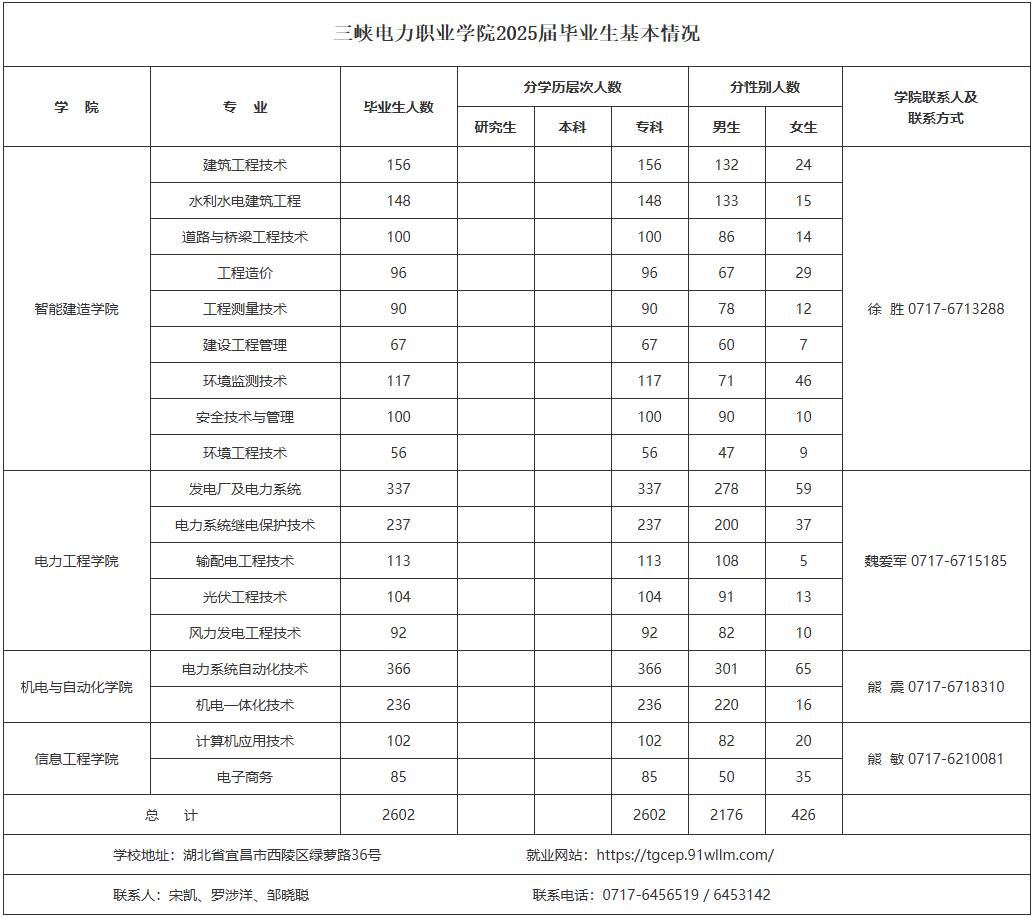 三峡电力职业学院2025届毕业生共2602人,其中,女生426人,男生2176人,详情见下图: