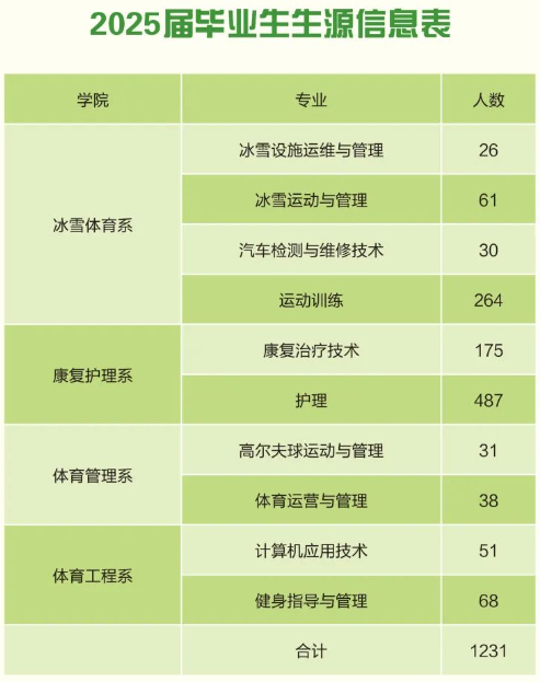 黑龙江冰雪体育职业学院2025届毕业生共1231人,详情见下图: